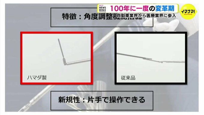 「大腸の手術で使うものなのですが、内視鏡手術で穴を開けて、トロッカー(手術用の管)から挿入して体内でクリップを置いてくるという機器になります。従来品は、違う鉗子で角度を変えていたが、ハマダが開発したものは、片手で操作ができて、角度も自由に変えられる」