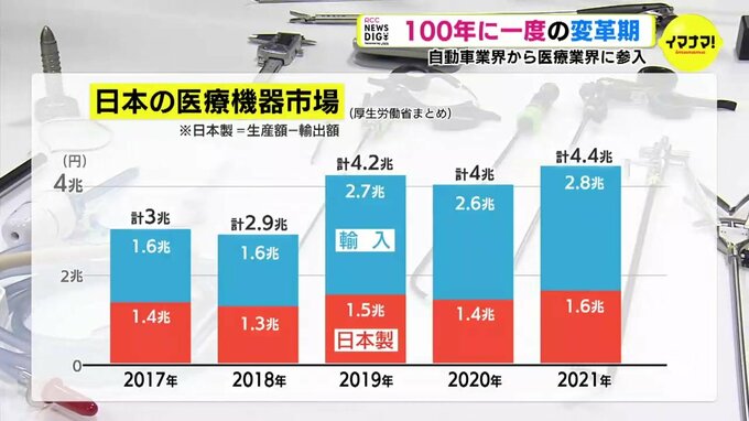 厚生労働省のまとめによりますと、日本の医療機器は年間4兆円規模の大きな市場ですが、海外からの輸入に頼っているのが現状です。
