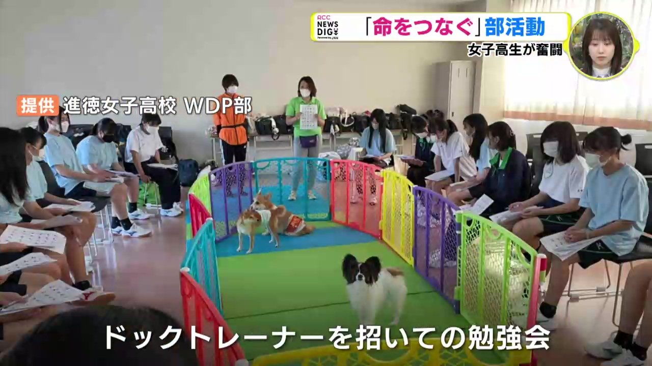譲渡会を仕切るのは、進徳女子高校(広島市)で創部5年目となる動物愛護ボランティア部「Walking with Dogs Project」=「WDP部」の面々。彼女たちは、こういった譲渡会をこれまで学校の内外で開催し、今回で5回目となります。