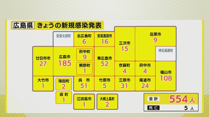 広島県内544人感染確認(25日)新型コロナ感染者数 2023年2月25日(土) 15:31 国内 新型コロナウイルス、広島県内の感染状況です。 25日は、広島市で185人、福山市で108人、東広島市で52人など、県内全体で合わせて544人の感染確認が発表されました。 また、患者5人の死亡が発表されました。