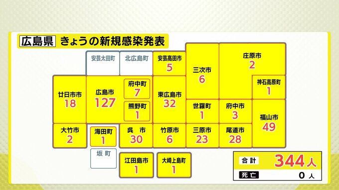 広島県内344人感染確認 新型コロナ感染者数(26日) 2023年2月26日(日) 15:22 国内 新型コロナウイルス、広島県内の感染状況です。 26日は、広島市で127人、福山市で49人、呉市で30人など、県全体で合わせて344人の感染確認が発表されました。 死者の発表はありませんでした。