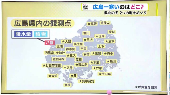 やっぱり八幡は、みなさん、雪のイメージを持っています。広島県にある気象庁の観測点は全部で33地点。すべての地点で「降水量」を観測しています。一方で「気温」を測っているのは19地点だけなんです。