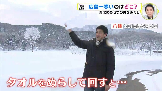 一方、同じ日の朝、自分は北広島町八幡に取材に行っていました。こちらも強烈な冷え込みで手元の気温計はマイナス20℃に迫る値を示していました。そこで極寒の地でよく見る、タオルを水で濡らして振り回すという実験をしてみると…、およそ2分で、濡らしたタオルはカチコチに凍ってしまいました。