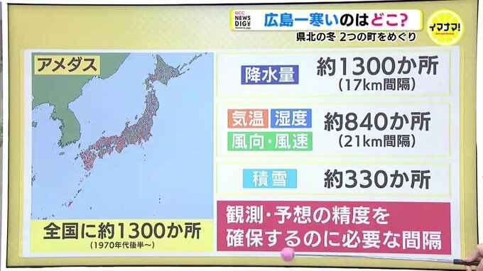 そうですね。ただ、結論を先に言うとそれは難しいだろうと思います。アメダスは、全国に約1300か所あって、▽「降水量」はすべての地点で観測(全国17キロ間隔)、▽「気温」は約840か所で観測(全国21キロ間隔)しています。