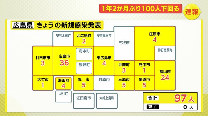 広島県内97人感染確認(6日)1年2か月ぶり100人下回る 新型コロナ感染者数 2023年3月6日(月) 15:09 国内 新型コロナウイルス、広島県内の感染状況です。 6日は、広島市で36人、福山市で24人など、県内全体で合わせて97人の感染確認が発表されました。県内の一日の発表が100人を下回るのは、40人だった去年1月3日以来、1年2か月ぶりです。