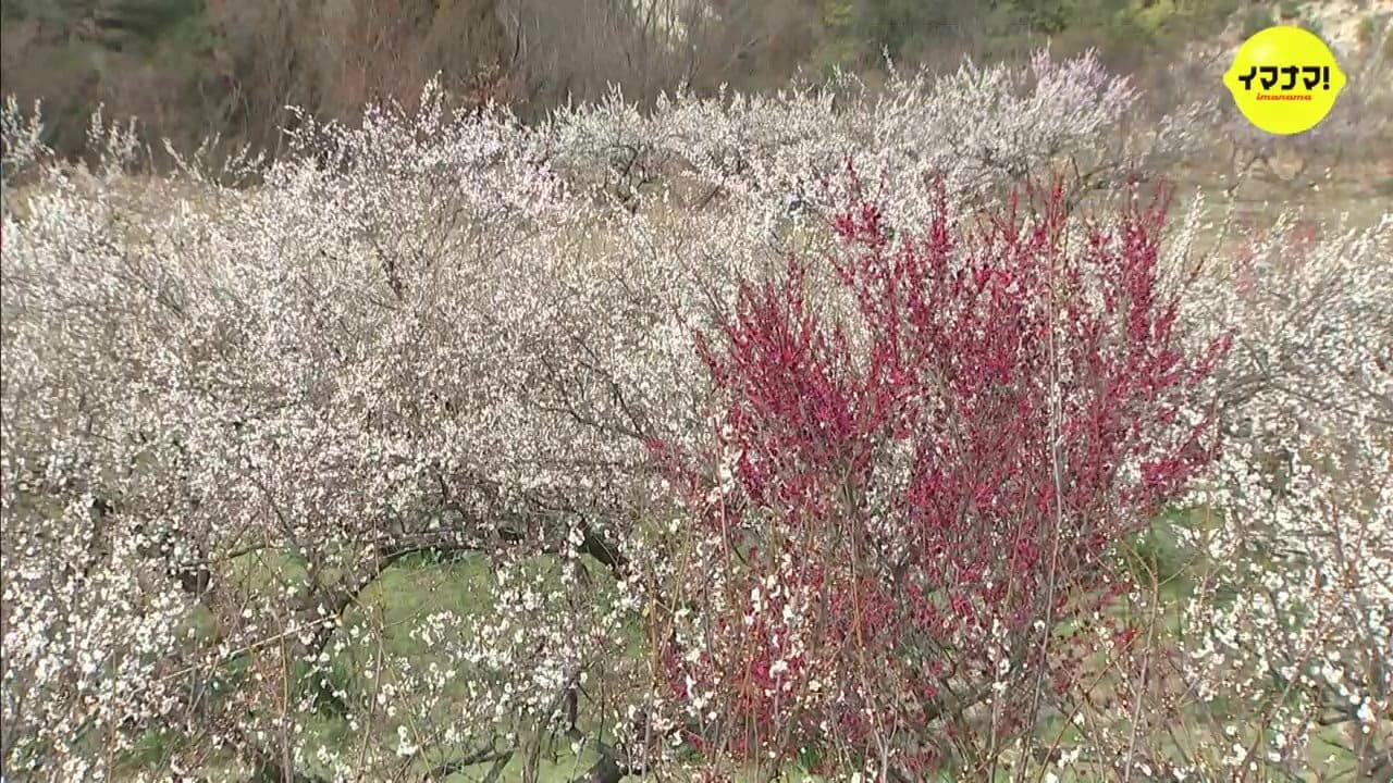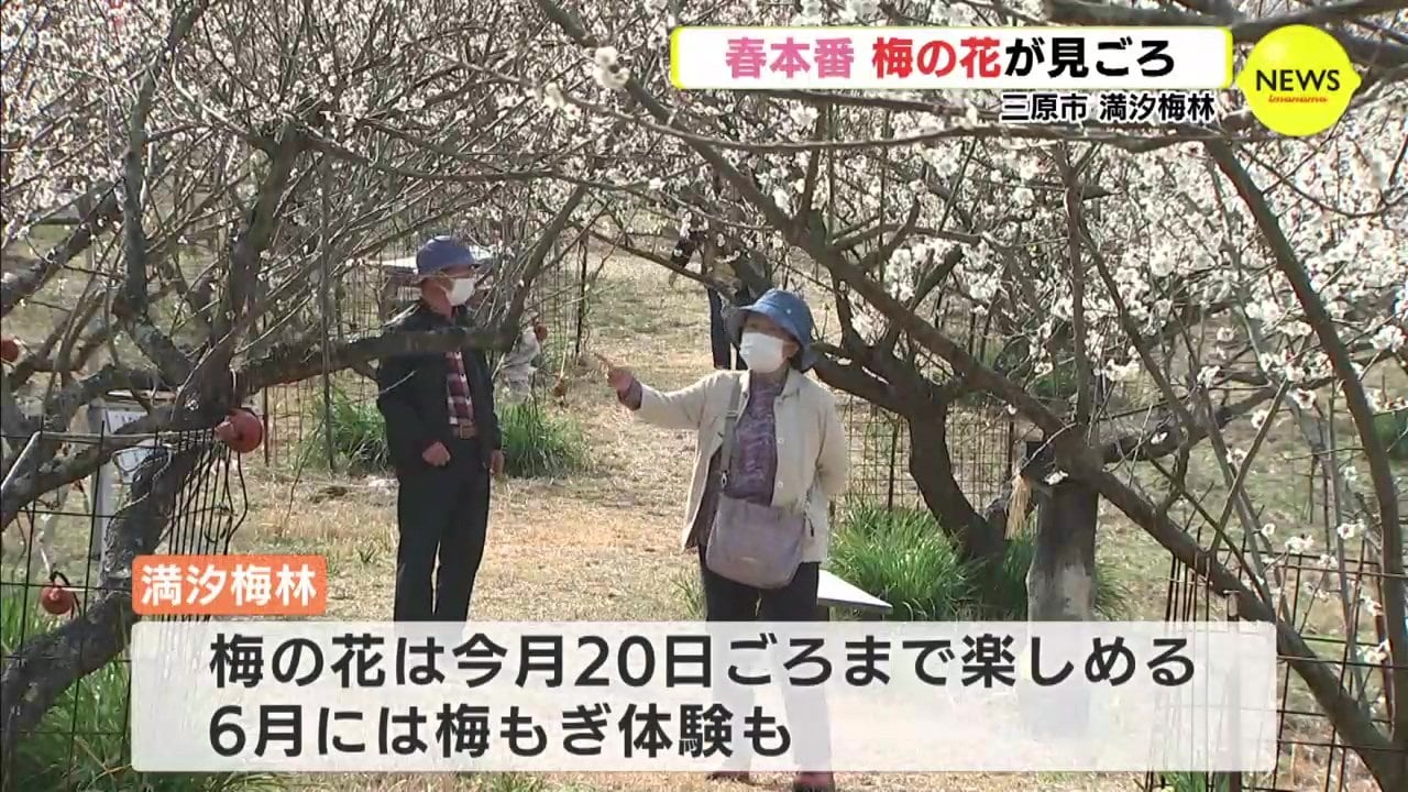 三原市にある「満汐梅林」です。広さおよそ2ヘクタールの日当たりのいい斜面に南高梅やしだれ梅などおよそ20種類1000本ほどの梅が植えられています。