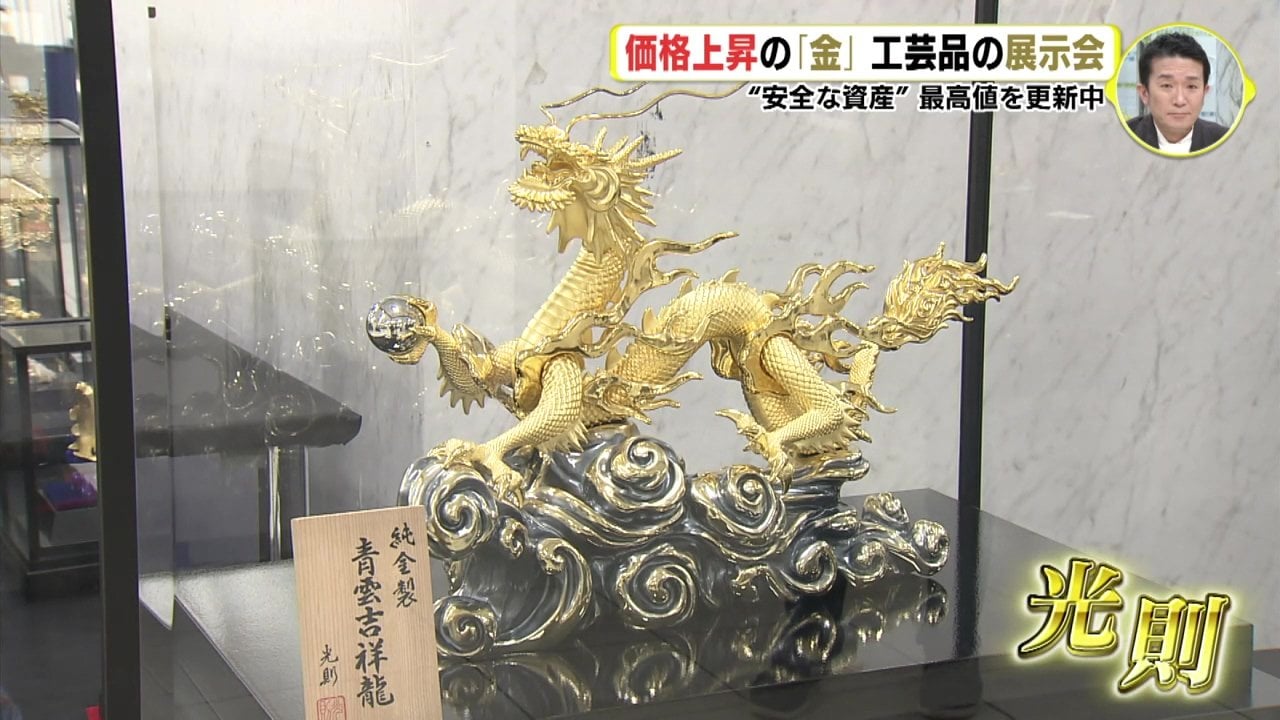 福屋では初めてとなる金の展示会に集められた作品の多くは、叙勲を受章した金工作家「光則」のブランドだということです。展示されているのはおよそ300点。