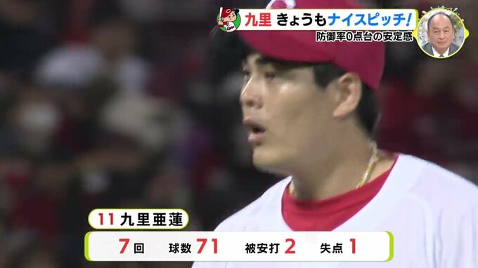 20イニングぶりの失点となった九里ですが、その後もテンポのいいピッチングで7回を投げて71球、被安打2・失点1とゲームを作ります。
