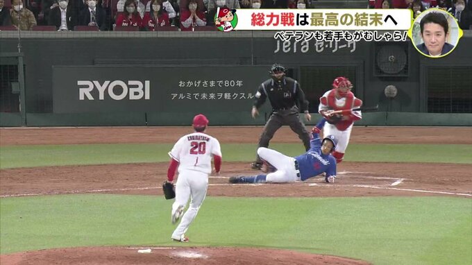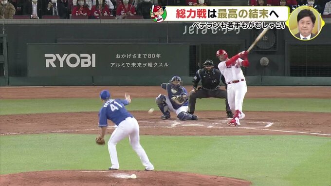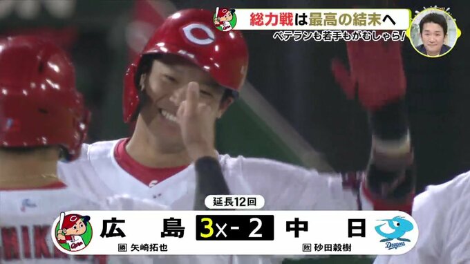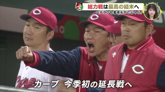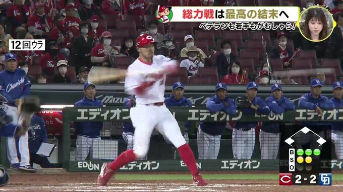 するとドラゴンズは、2ストライクからスクイズ! しかし、空振りを誘って三振。さらにランナーを栗林が必死に追いかけ、3アウト。カープにとって今シーズン初の延長戦にもつれ込みます。