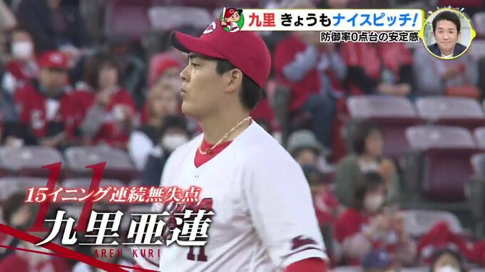 カープの先発は、過去2試合・15イニング無失点の 九里亜蓮 でした。1回・2回とランナーを出しますが、九里の持ち味である内野ゴロでダブルプレー。そしてキャッチャー・坂倉将吾 の盗塁阻止で三振ゲッツーと無失点を続けます。