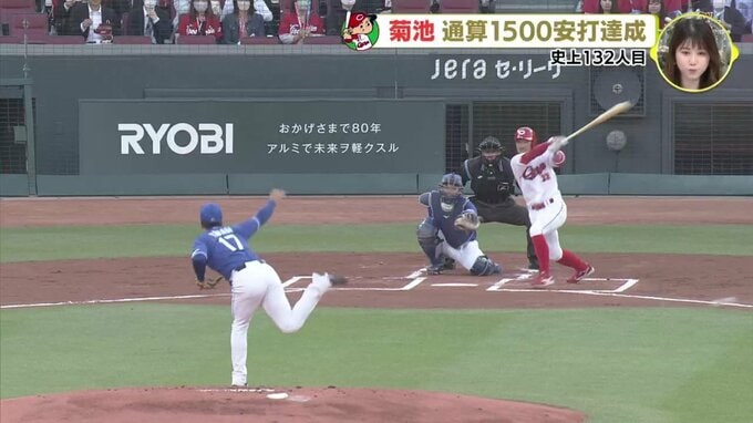 10年連続ゴールデングラブ賞に、歴代5位の328の犠打もマークしながら、1500安打まであと1本に迫ったプロ12年目の 菊池涼介 。注目の第1打席。サードが弾く間に菊池は1塁を駆け抜けます。記録はヒットの判定となり、史上132人目の1500安打達成となりました。