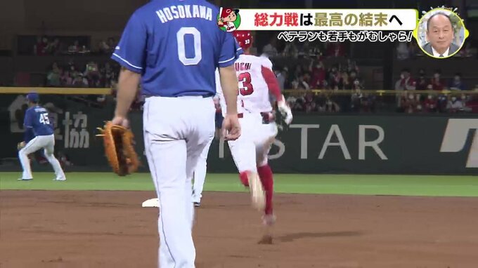カープは、そのウラ。先頭の菊池。この日の3本目、通算1502安打目となるヒットが2ベースとなり、チャンスを作ると、2番の 野間峻祥 が、1塁線を破る痛烈な打球。タイムリー3ベースとなり、1点差に迫ります。