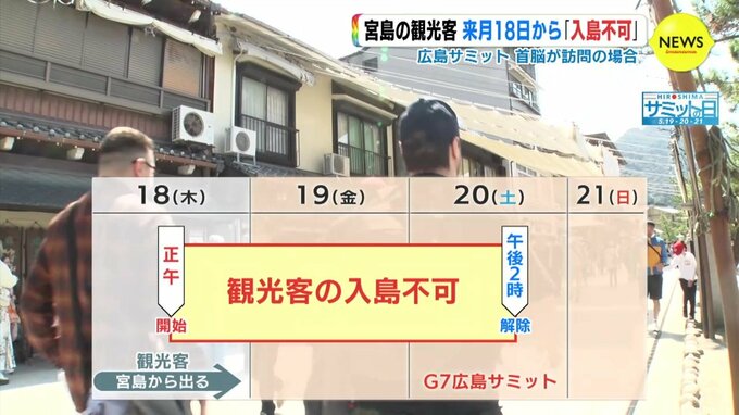 G7サミット期間中に首脳訪問が決定した場合、5月18日 正午~20日午後2時、一般観光客の宮島入島を「不可」。期間中の入島には通勤・通学する人や事業者は、識別証や車両証が必要となる。