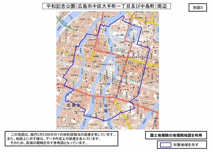 範囲:平和公園周辺 広島市中区大手町1丁目、中島町、その周囲約1kmの範囲の地域)