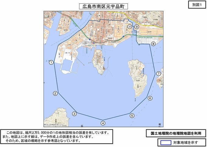 範囲:広島市南区元宇品町及びその周囲約2.5kmの地域(海域含む)