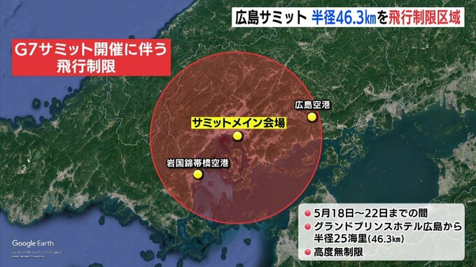 定期便は対象外で、制限区域内にある広島空港と岩国空港発着の定期便に影響なし。警察や消防、許可を得た報道機関のヘリコプターは飛行可。