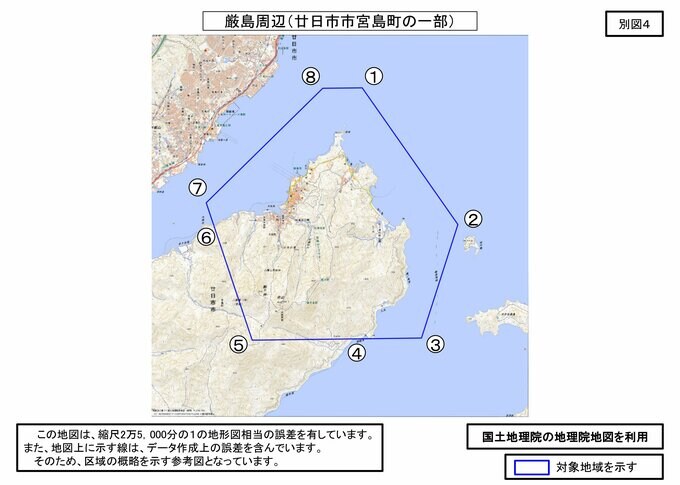 範囲:厳島周辺 廿日市市宮島町の一部及びその周囲約1kmの範囲内の地域(海域を含む)