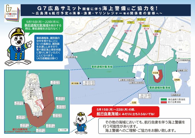 宇品島沖での船舶の航行自粛を呼びかけ。このほか、広島市の市街地へつながる河口部を通る場合は、事前に海上保安本部に知らせる必要があり、許可を受けた船舶には「識別旗」が配られる。