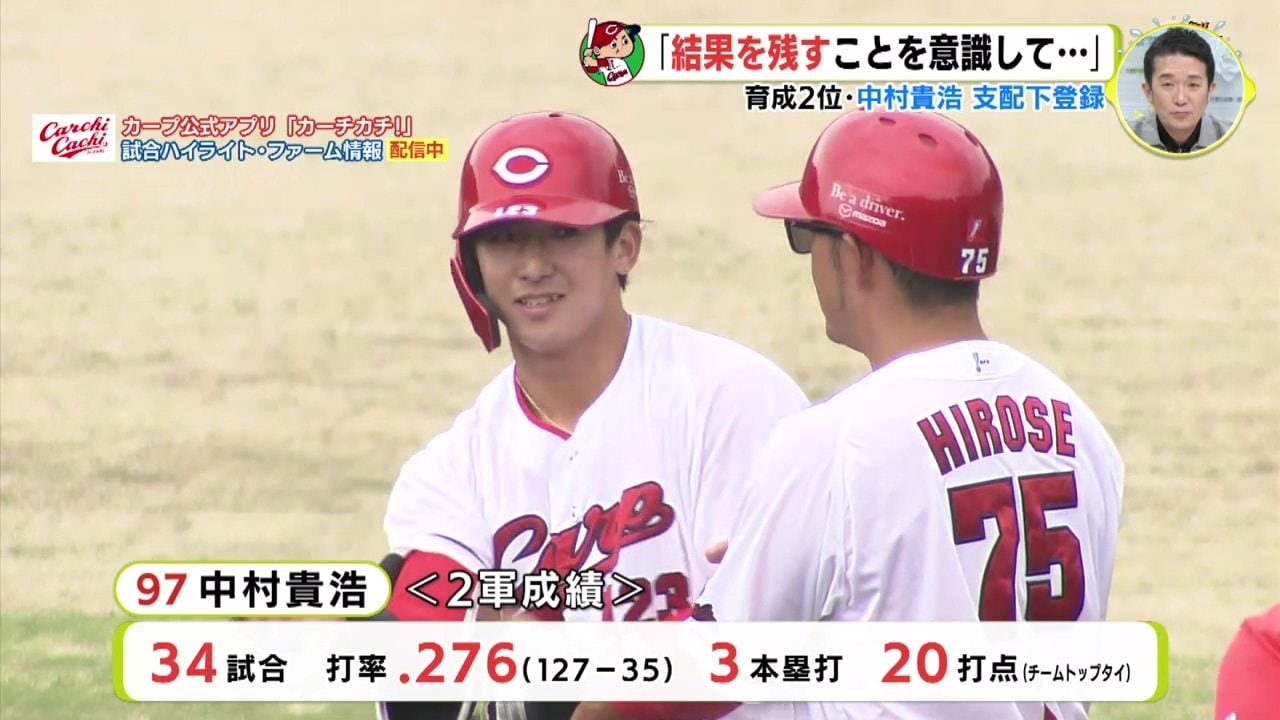 広島カープは、17日、育成選手の 中村貴浩 と支配下選手契約を結んだと発表しました。背番号は123から97になり、1軍の試合に出場できるようになりました。