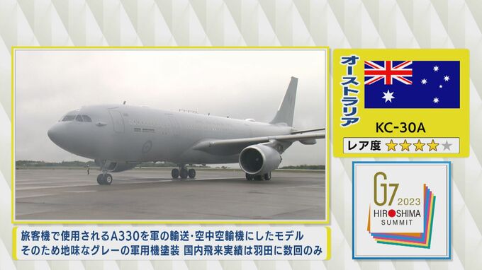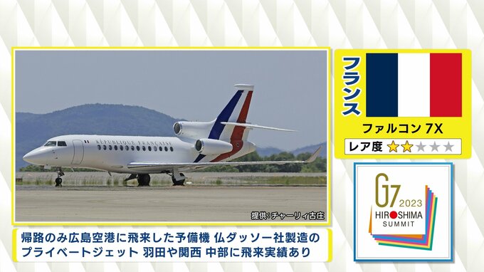 ウクライナのゼレンスキー大統領が乗ってきた機体。フランス空軍のエアバスA330型機が使用され、フランス大統領搭乗機と同型機ではあるが、カラーリングが少々異なる。サウジアラビアのジッダから広島空港に到着し、帰路はポーランドのジェシュフ(現在のウクライナの玄関口)へ北回りで飛行した。日本にも飛来実績があるため、★3つ。