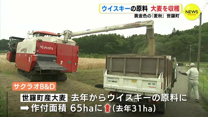 世羅町の大麦は、以前から地元のJA尾道市を通して廿日市市の酒造メーカー「サクラオブルワリー&ディスティラリー」に焼酎の原料として出荷されていました。メーカーの意向で去年から全量をウイスキーの原料として納入することになり、作付け面積も去年の倍以上のおよそ65ヘクタールに増やしました。