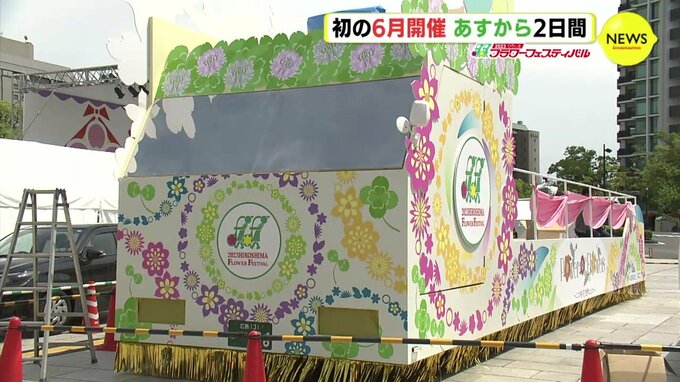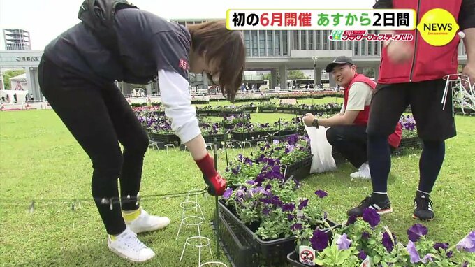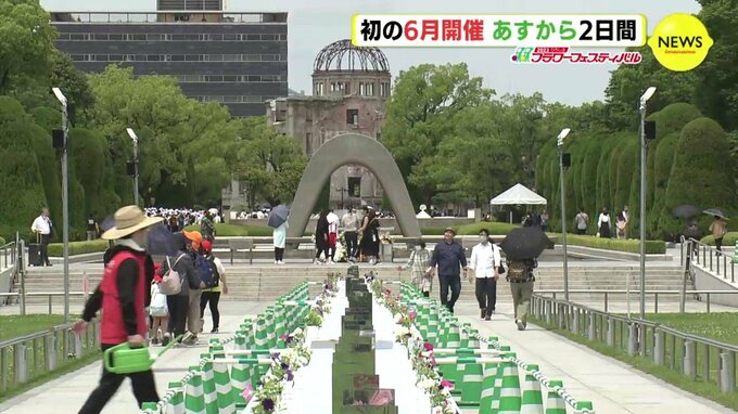 初めて6月に開かれる「ひろしまフラワーフェスティバル」が、あす10日、開幕します。メイン会場の1つ平和公園(広島市)でも準備が進められています。