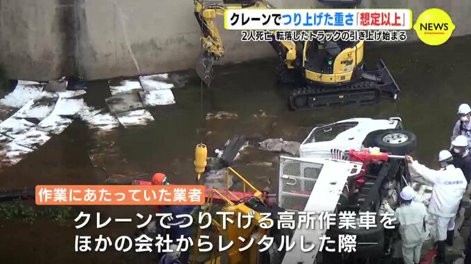 今月、広島市でクレーンを搭載したトラックが放水路に転落し作業員2人が死亡した事故で、県はクレーンが吊り下げていた高所作業車が、作業にあたった業者の想定より重いものだったことを明らかにしました。