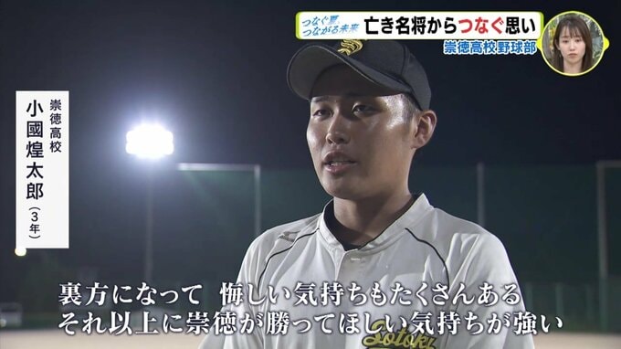 「裏方になって、くやしい気持ちもたくさんあるんですけど、それ以上に崇徳が勝ってほしいという気持ちが強いので、そのぶん、しっかり声を出してチームに貢献できるようにがんばっています。自分のポジションはキャッチャーなので、しっかりピッチャーの状態を見ながらピッチングを受けたりだとか、そういうところ、目配り・気配りでチームに貢献していると思います。3年間、一緒にやってきた仲間と甲子園に絶対出たいと思っているので、自分はスタンドですが、応援でがんばってもらいたいと思います」