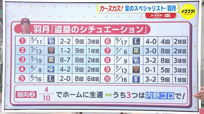 さらに、代走だけではなくて、6個目と9個目の盗塁はスタメンで出ているんです。4試合しかスタメンはないんですが、2試合のスタメンの日、4回・5回と早いイニングに自分でヒットを打って盗塁しているという傾向もあるんです。