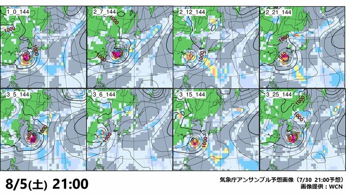 気象庁が週間天気予報のために計算しているアンサンブル予報の一部です。8月5日21時の天気図を見ると、台風6号は大陸へ進んだものや東シナ海を北上しているもの、西日本付近に達しているものなどさまざまです。
