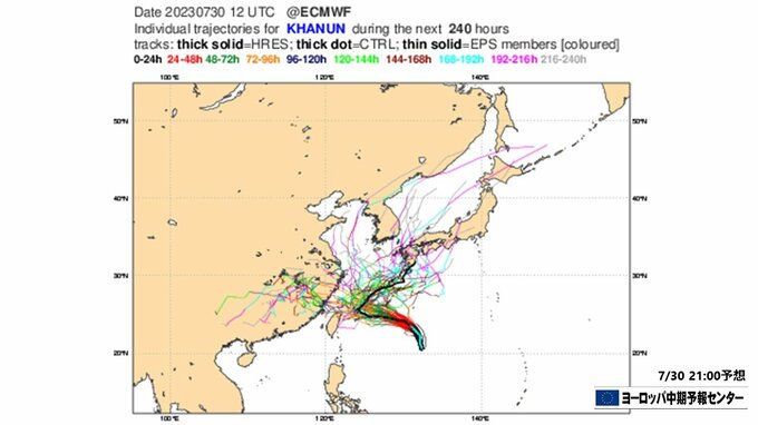 ヨーロッパ中期予報センターの台風6号に関するアンサンブル予想です。ラインの1つひとつが計算結果です。沖縄付近に来たあとの進路予想がバラバラとなっています。中国大陸に進む予想もあれば東シナ海を北上する予想、また九州方面へ進む予想などバラバラです。それだけ進路予想にブレ幅が出ていることを示しています。