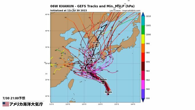 アメリカ海洋大気庁の数値予報モデルを見ても同様にバラツキが大きくなっていますが、数日前よりも東シナ海を北上する結果が多くなっています。
