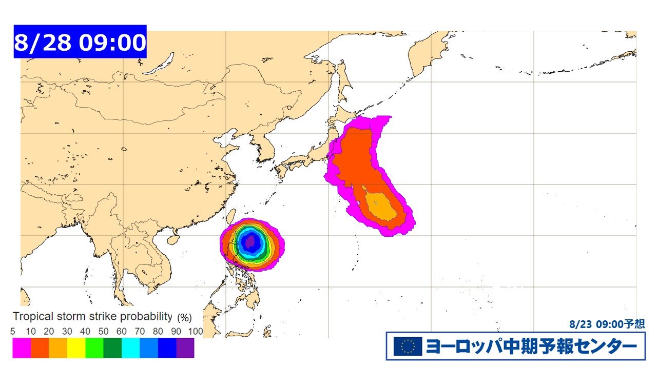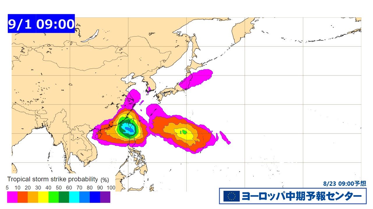 さらに先である9月1日(金)の予想をみると、日本の南海上に新たに確率が高くなったエリアが確認できます。これは別の熱帯低気圧が発生したこを示している可能性があります。