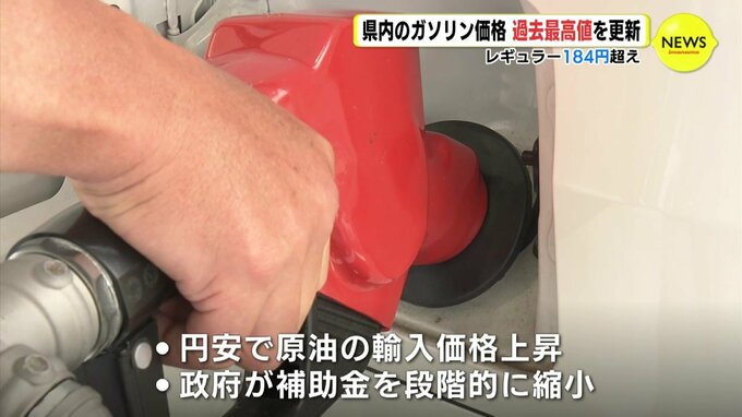 全国の平均価格も185.6円と過去最高で、円安によって原油の輸入価格が上昇していることや、政府が石油の元売り会社に支給しているガソリン補助金を段階的に縮小していることなどが値上がり要因となっています。