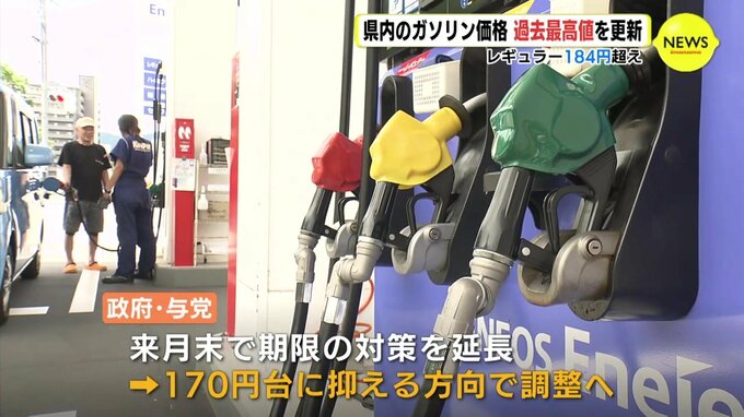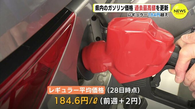 先週よりも2円高く、14週連続の値上がりとなりました。県内でこれまで最も高かったのは2008年の183.2円でしたが、初めて184円を超えて過去最高値を更新しました。
