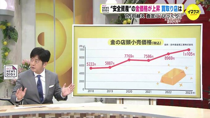 金の価格について、おさらいしたいと思います。2000年代のはじめまでは1グラム当たり1000円程度だったんですけども、極端に上がり始めたのは、ここ数年だということです。2018年は5000円台(最高値5222円)なんですが、コロナ禍が本格化した2020年は7000円台(最高値7769円)になり、ついに2023年は1万105円。ウクライナ情勢もあって2021年以降も上昇を続けていると。
