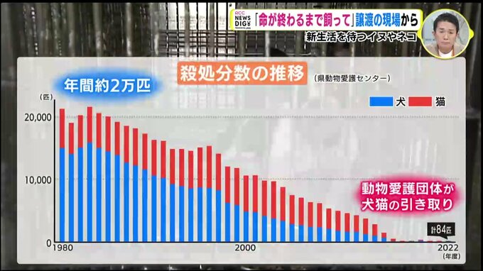 当初、施設では年間およそ2万頭が殺処分され、処分数が全国ワーストの年もありました。その後、動物愛護団体が、イヌ・ネコの引き取りを始めたことがきっかけで大幅に減少しました。いまでは、病気からの回復が見込めないなどの場合は、やむを得ず安楽死させていますが「事実上、殺処分のない状態」となっています。
