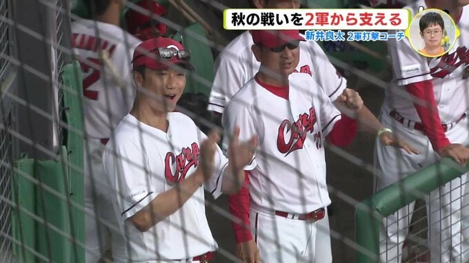 新井貴浩 監督は、「チームは家族。1軍も2軍もない」と言い切ります。シーズン終盤、新井良太コーチはファームのグラウンドでともに戦っています。