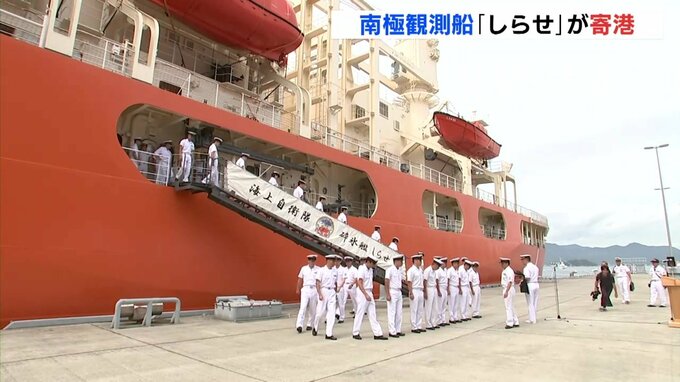訓練の途中に補給や乗組員の休業を兼ねて、2年ぶり9回目の寄港となりました。入港式では、花束贈呈のあと、「しらせ」の斉藤一城艦長が「ぜひ見学してもらい、南極観測事業の理解への一環になれば」とあいさつしました。