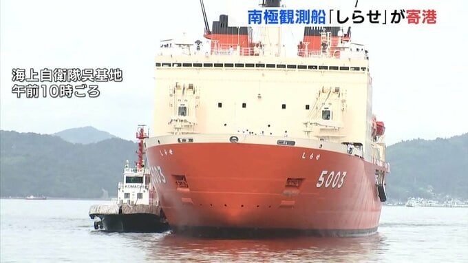 隊員と関係者などおよそ120人の出迎えを受け、海上自衛隊呉基地に入港したのは、南極観測船として活躍している砕氷艦「しらせ」です。