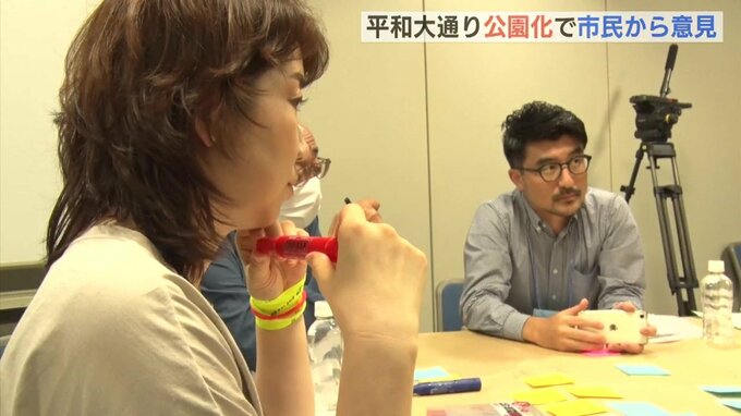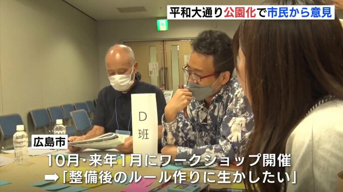 ワークショップには、平和大通り沿いの町内会や商店街組合のメンバーが参加しました。広島市は、平和大通りの約2.6キロの緑地帯に休憩所やウッドデッキを設け、2026年度までの公園化を計画しています。来年度中には公園内の飲食店などを公募する予定です。