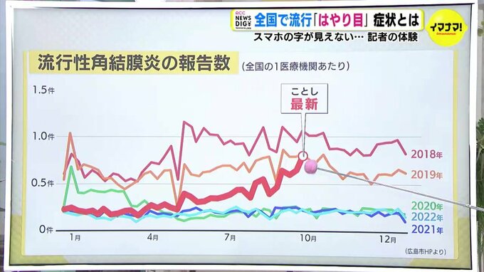 「全国の流行状況の推移です。2023年は過去5年間と比べてどうだったのでしょうか。2023年春先から右肩上がりで増えています。2021年・2022年と比べると、9月に入って3倍程度に増えています」