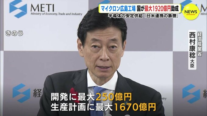 「日米連携の象徴」マイクロン広島工場に国が最大1920億円の助成金 2023年10月4日(水) 17:08 国内 東広島市に拠点を置くアメリカの半導体大手マイクロン・テクノロジーの日本法人に対し、経済産業省は最大1920億円を助成すると発表しました。経済産業省 西村康稔大臣「開発に対して最大250億円、生産計画に対し…