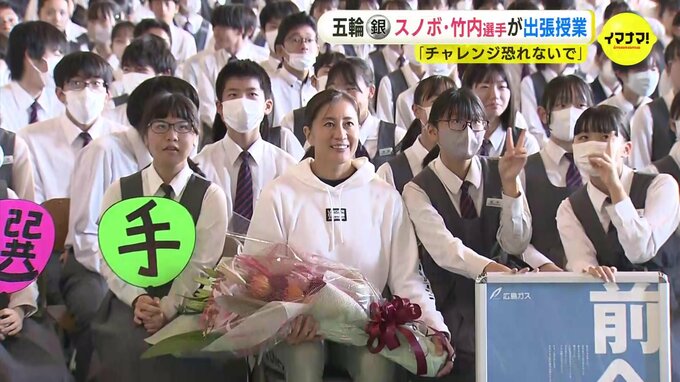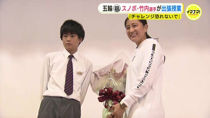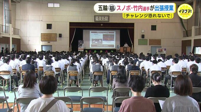 オリンピックのスノーボード銀メダリスト・竹内智香選手が13日、広島市の中学校で出張授業を行いました。