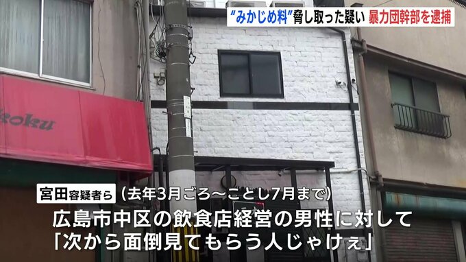 警察によりますと2人は共謀して、去年3月ごろから広島市中区の飲食店経営の男性に対して、「次から面倒見てもらう人じゃけぇ」などと佐々木容疑者が宮田容疑者を紹介したあと、ことし7月までの間、17回にわたって現金合わせて51万円を「みかじめ料」として脅し取った疑いがもたれています。