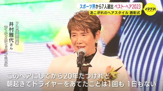 広島市中区のホテルで開催された「ベスト・ヘア2023」の表彰式には、年代別受賞者7人がそろいました。10代の受賞者、スポーツクライミングの 森秋彩 さんから、70代の受賞者、アーティスティックスイミングの指導者・井村雅代 さんまで全ての年代がスポーツ界で活躍しています。