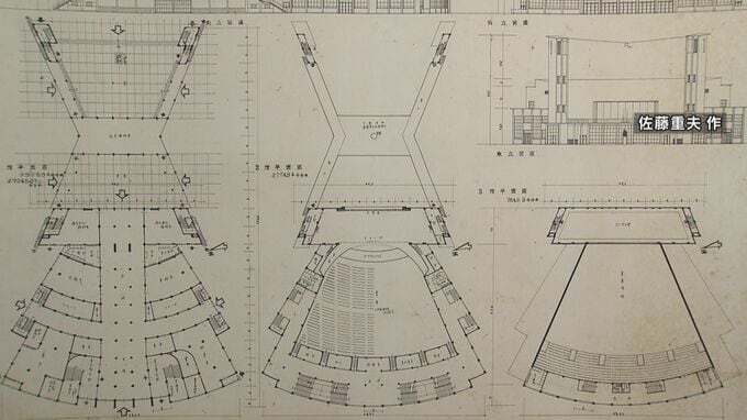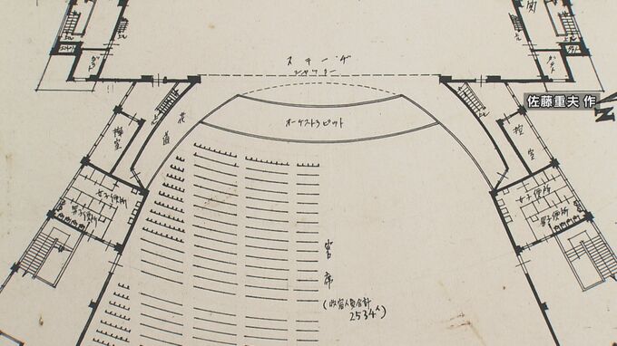 平和記念館の立面図と平面図をよく見ると、「収容人員合計2534人」と書かれた客席と、オーケストラピットを備えたステージがある大きなホールが書き込まれています。