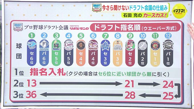 ウエーバー方式という制度がドラフトでは導入されているんです。1位指名は、重複した場合はくじなんですが、2位以下はまずはセ・リーグの順位が悪かった方から6位・5位といって、カープの2位は総合で21番目の選手が獲得できると。さらに折り返して、今度は3位は成績がよかったチームからということになるので、28番目の選手の交渉権を得ることができるということなんです。なのでシーズンの成績がよければ、ドラフトはちょっと2位は指名が遅くなるということになっているんです。