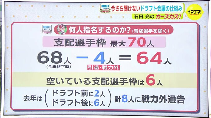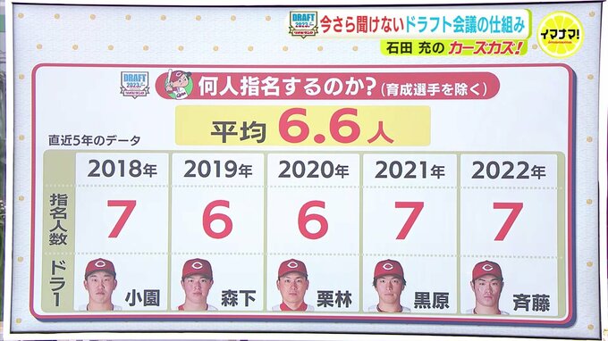 ただ、去年は7人指名した後に6人、戦力外がありました。指名する選手の人数によって、その後、首脳陣はいろいろ選手の構成を考えるということになるんです。ことし、どれぐらいの選手を何人取るのかというのもいろいろ想像しながら見ていただきたいと思います。