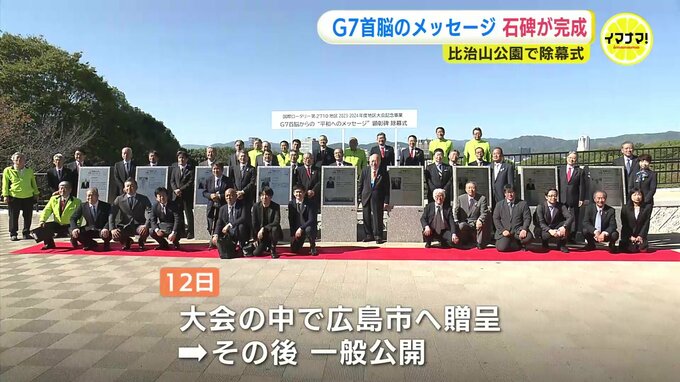 サミットで首脳が残したメッセージ 広島を見下ろす丘に石碑が完成 「碑の持つ意味をここで考えて」 2023年11月8日(水) 18:54 国内 広島サミットで原爆資料館の芳名録に残された各国首脳のメッセージを刻んだ石碑が完成し、8日、除幕式が行われました。碑を建てたのは、広島県と山口県に72あるロータリークラブの団体です。9基ある碑にはG7サミッ…